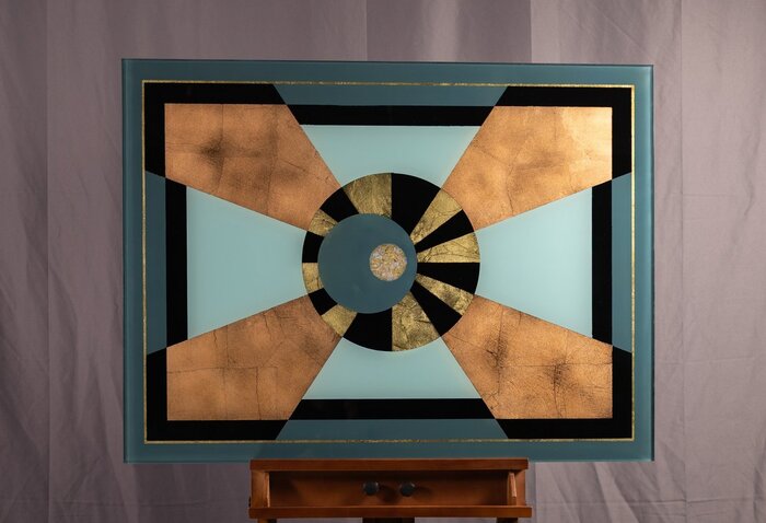 A modern take on architectural Art Deco. This work draws on the visual language of the 1920s–30s—symmetry, radiance, sacred geometry. The palette echoes the era: oxidized green, black, copper, gold. The image is printed on the reverse side of glass. Geometry becomes light. Silence becomes form.