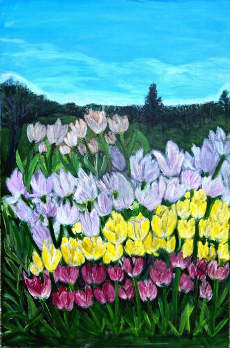 The Tulip Tapestry, Mageswari Srinivasan, 2025, acrylic on canvas, 30 x 24 in. / 76.2 x 60.96 cm.