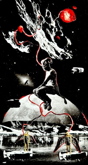 Suspended in the dark between sky and underworld, a creature bound by veins evokes a myth of formation, control, and sorrow across celestial, liminal, and earthly realms. In the cosmic void, it becomes a living myth of emergence, power, and loss.