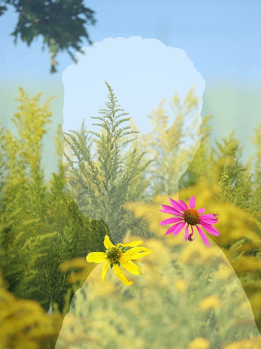 The silhouette of a woman's head and shoulders is layered with a lush landscape and the flowers of native plants. Much of my work is about reclaiming or "rewilding" both inner and outer landscapes as a metaphor for healing and connection.