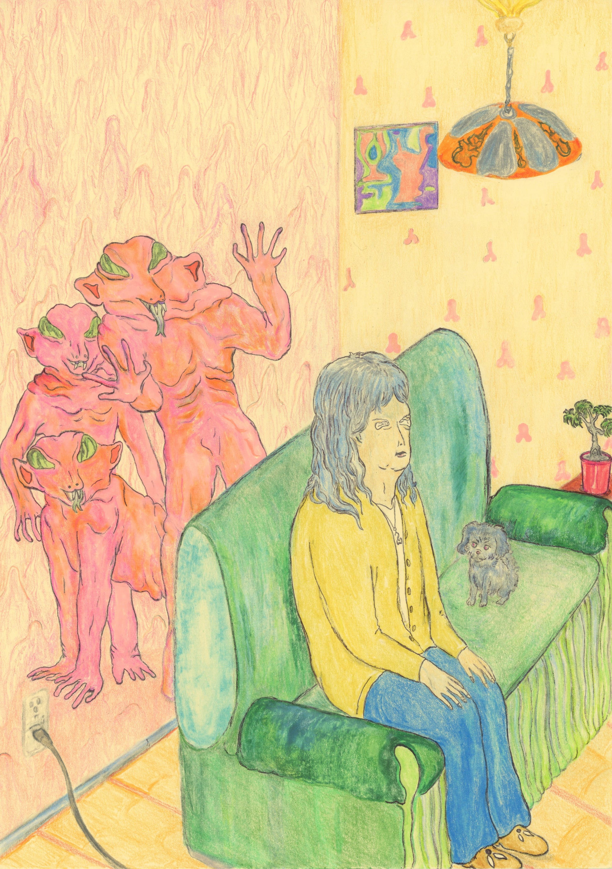 Watched From a World Within Wallpaper, 2023, colored pencil on paper, 11.7 x 8.3 in. / 29.718 x 21.082 cm.