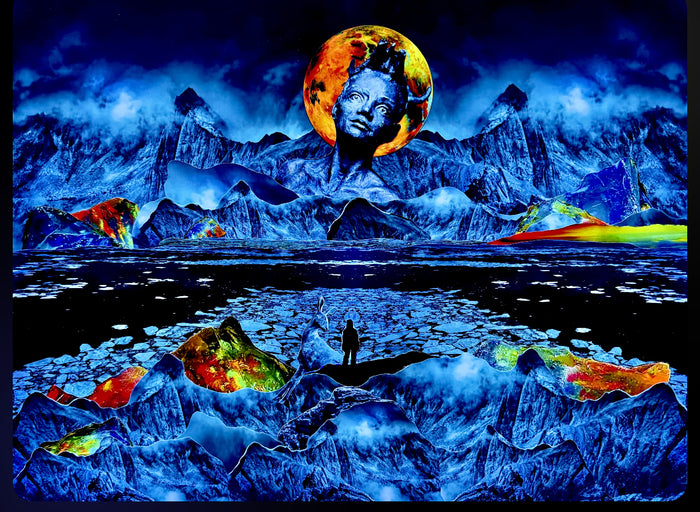 A figure with an animal stands at the edge, facing the horizon where a looming presence waits—seen or imagined. Nothing is unseen or hidden here. The watcher watches back. No one knows who is watching whom. And there is no escape.