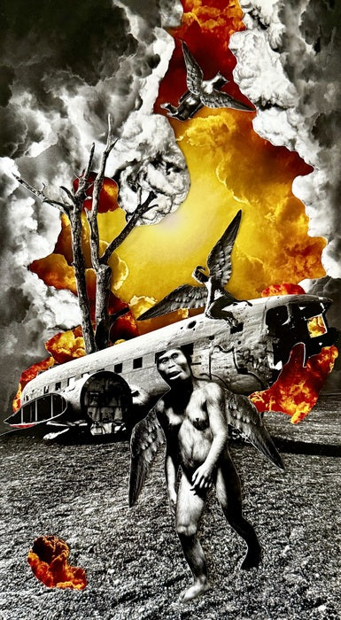Where Wings Once Meant Hope, 2025, hybrid collage, 11 x 18 in. / 27.94 x 45.72 cm.