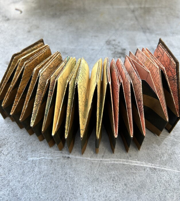 As I thought of my family, I realized we have been moving far over the generations. My grandfather from Sicily to New York, myself from the US to Switzerland, then my daughter from Switzerland to Boston. This book honors travelers the world over. Turkish map folds set in an accordion fold structure.